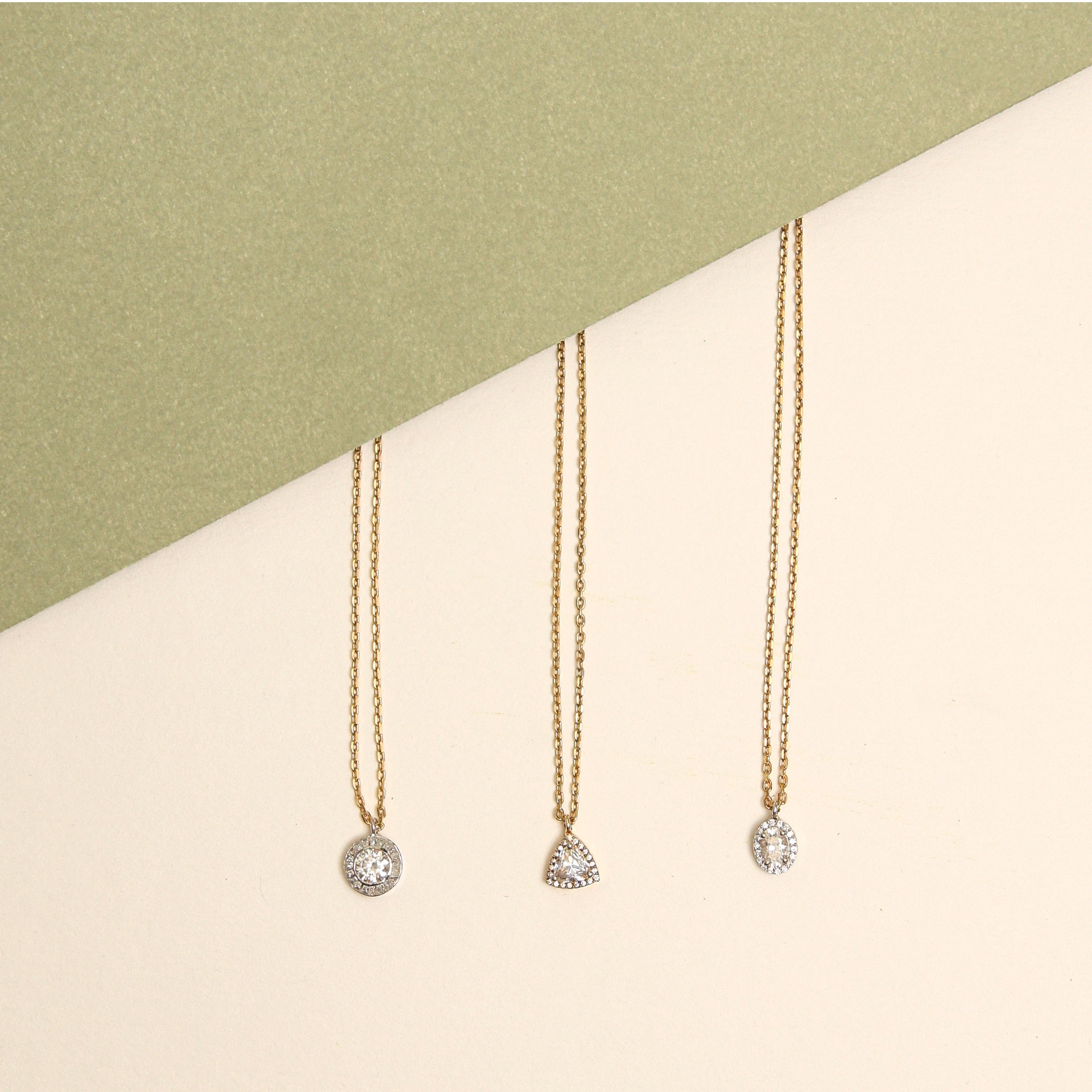 Miapia's solitaire necklaces redefine elegance with a single, captivating Moissanite diamond suspended on a delicate vermeil gold chain.