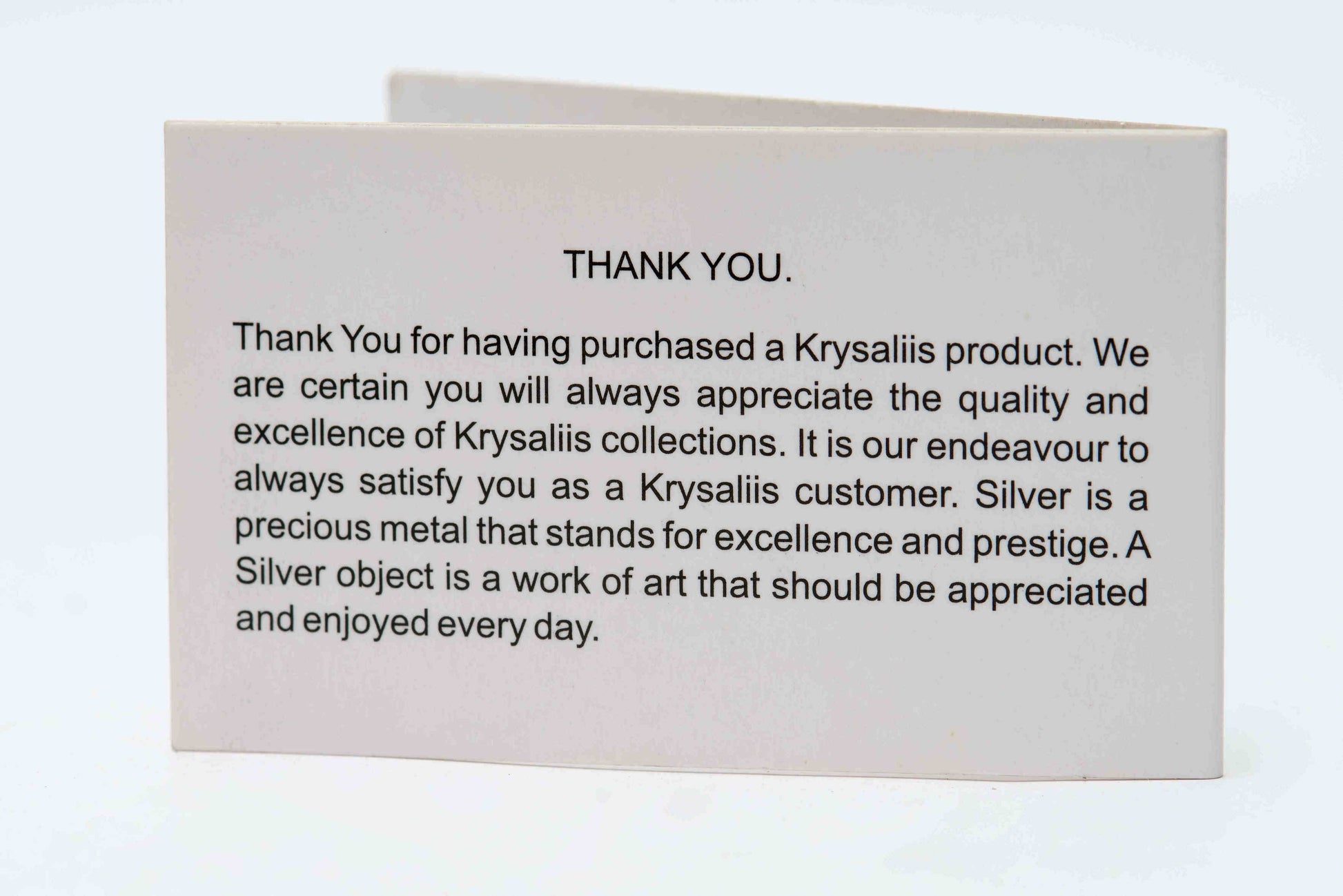Krysaliis is committed to customer satisfaction. We accept returns on non-engraved items within 48 hours of shipment. When received, we will issue a credit for the purchase price of the item minus any shipping costs we have incurred. That’s it.